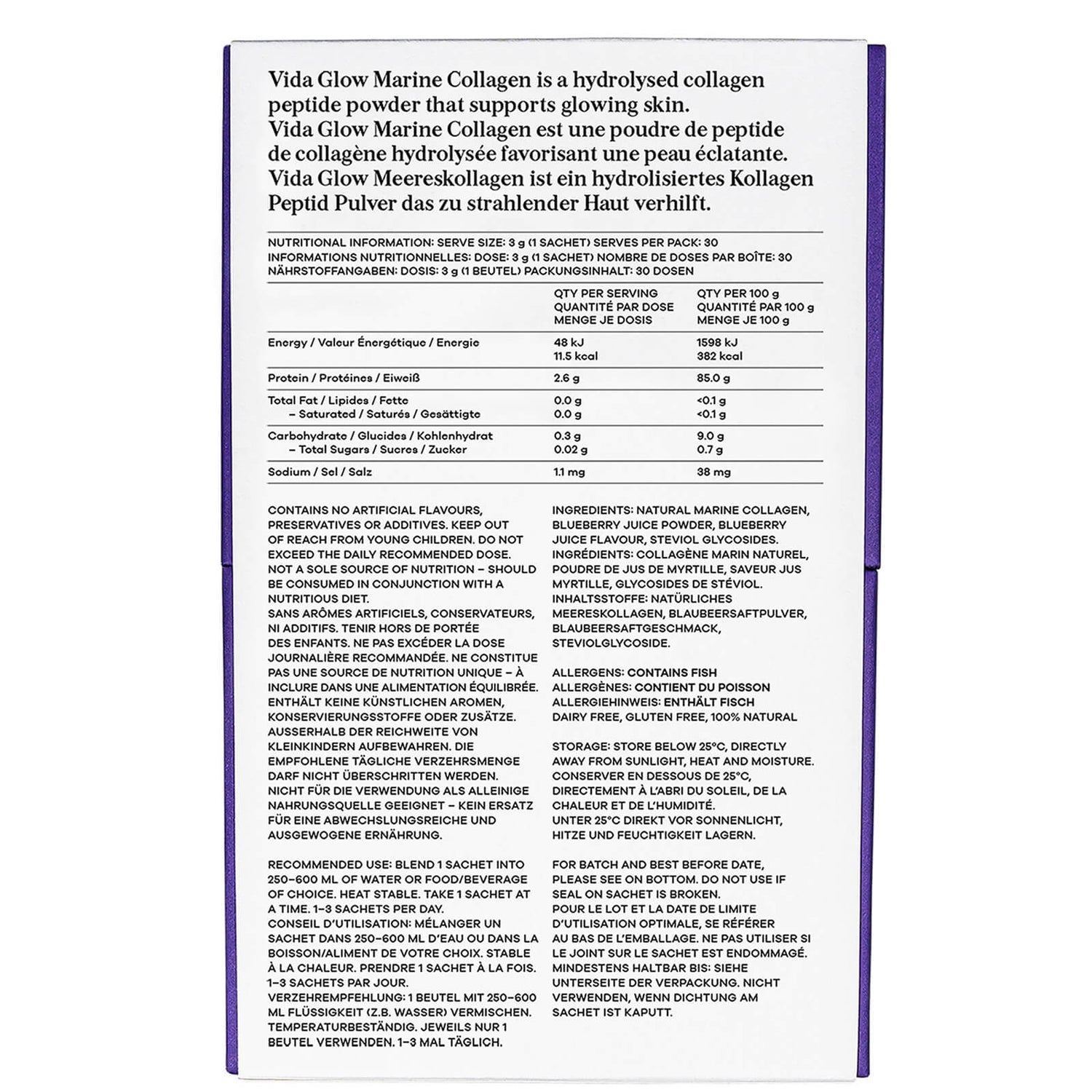 Natural Marine Collagen (Blueberry) is a collagen peptide supplement made from sustainably-sourced fish skin. Vida Glow’s hydrolysed marine collagen has been activated to boost absorption (so your body can actually use it) and stimulate fresh collagen production.