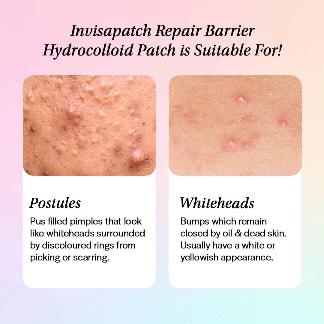 Target breakouts fast with the Invisapatch Repair Barrier™, an ultra-thin, invisible hydrocolloid patch that treats blemishes while blending seamlessly into your skin. Designed for all-day or overnight wear, this discreet patch draws out impurities, reduces redness, and speeds up healing, without irritation. Powered by Salicylic Acid, Tea Tree Oil, and Centella Asiatica, it soothes and protects while preventing picking and scarring. See visible results in as little as 6 hours. Safe for all skin types, including sensitive.