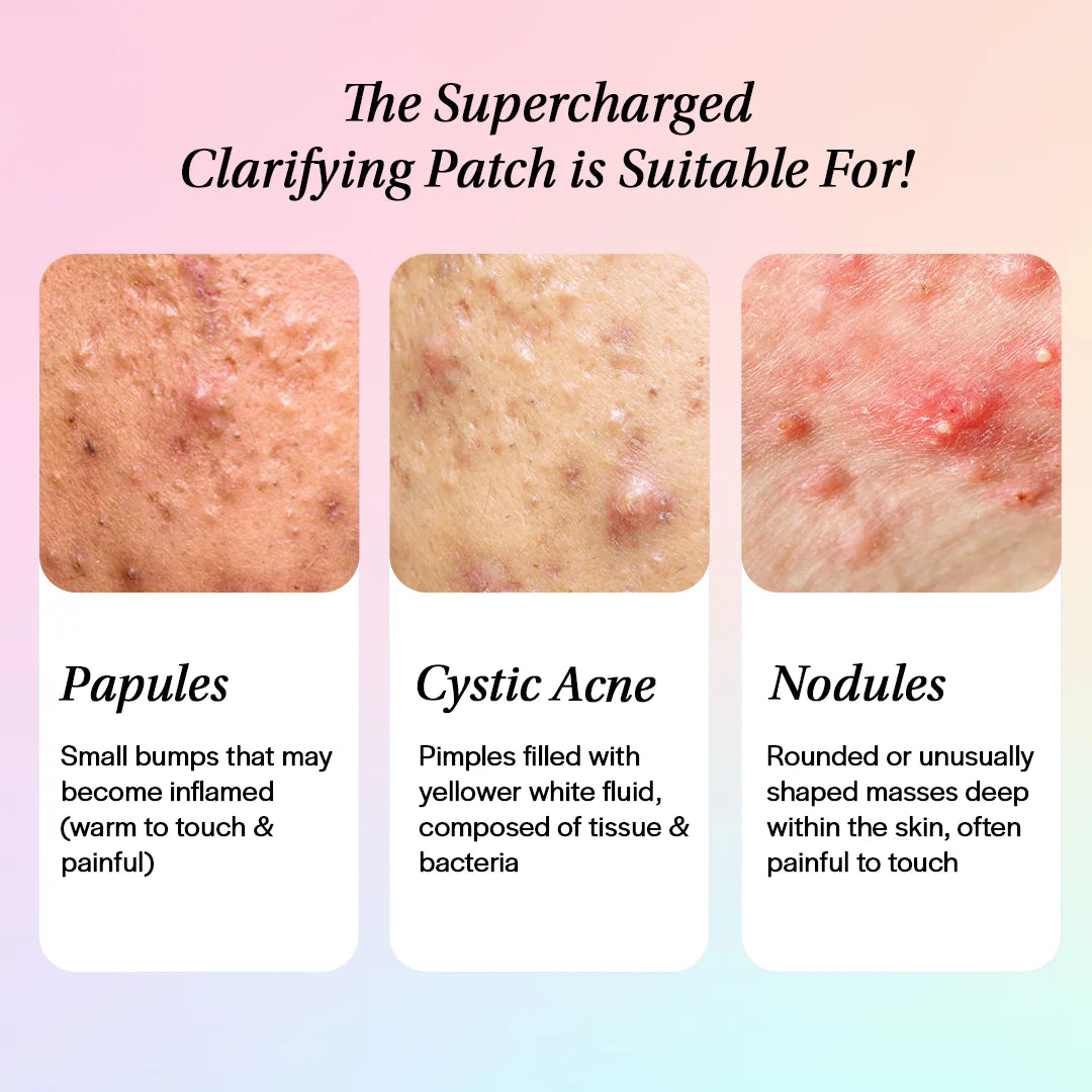 Follow our simple three-step application process for best results: 1. Cleanse & dry the target area.2. Apply the Supercharged to the targeted area. Press lightly for 15 seconds.3. Wear whenever day or night for the best results. Leave for 6-8 hrs. Repeat daily for maximum effectiveness. Get clearer skin in no time!
