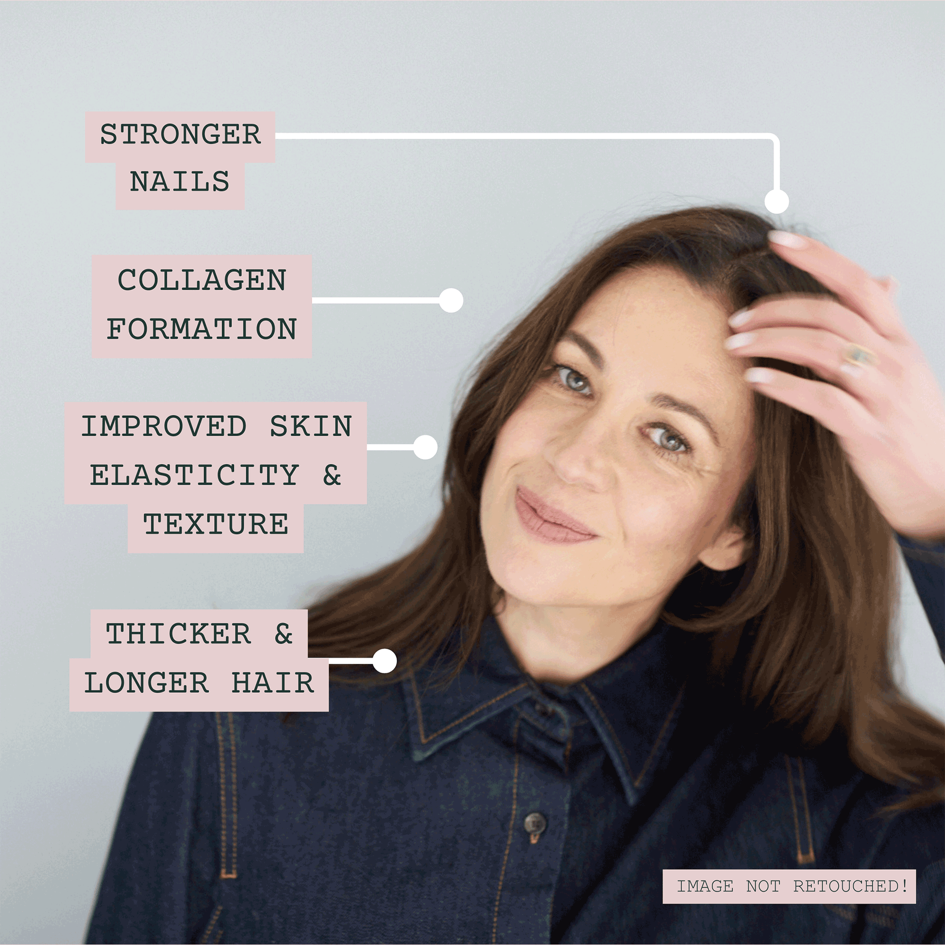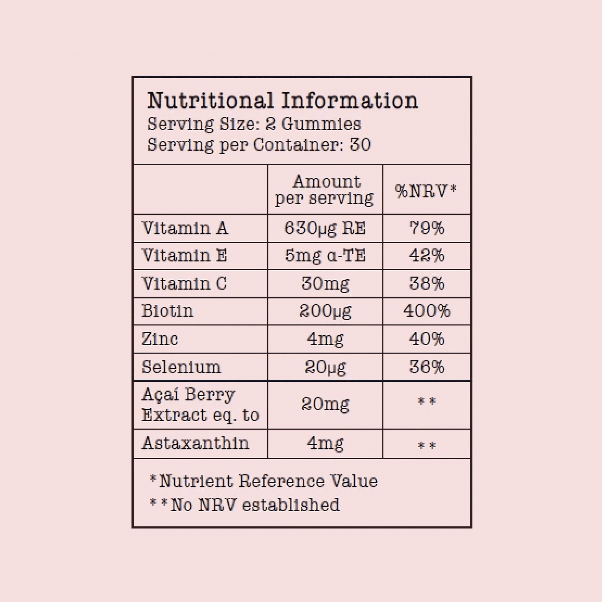 Provides essential vitamins to support overall skin, hair, and nail health (Vitamin A, Vitamin C, Vitamin E, Biotin).